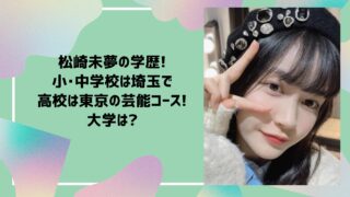 女優 松崎未夢の学歴!小・中学校は埼玉で高校は東京の芸能コース!大学は? ナチュラルな演技と透明感あるビジュアルで注目を集める、若手女優の松崎未夢(まつざき みゆ)さん。ドコモのスペシャルムービーやドラマ『最高の教師』への出演など、次世代を担う存在として注目が集まっています。今回は松崎未夢さんの学歴を見ていきまし... 2025.09.16 女優